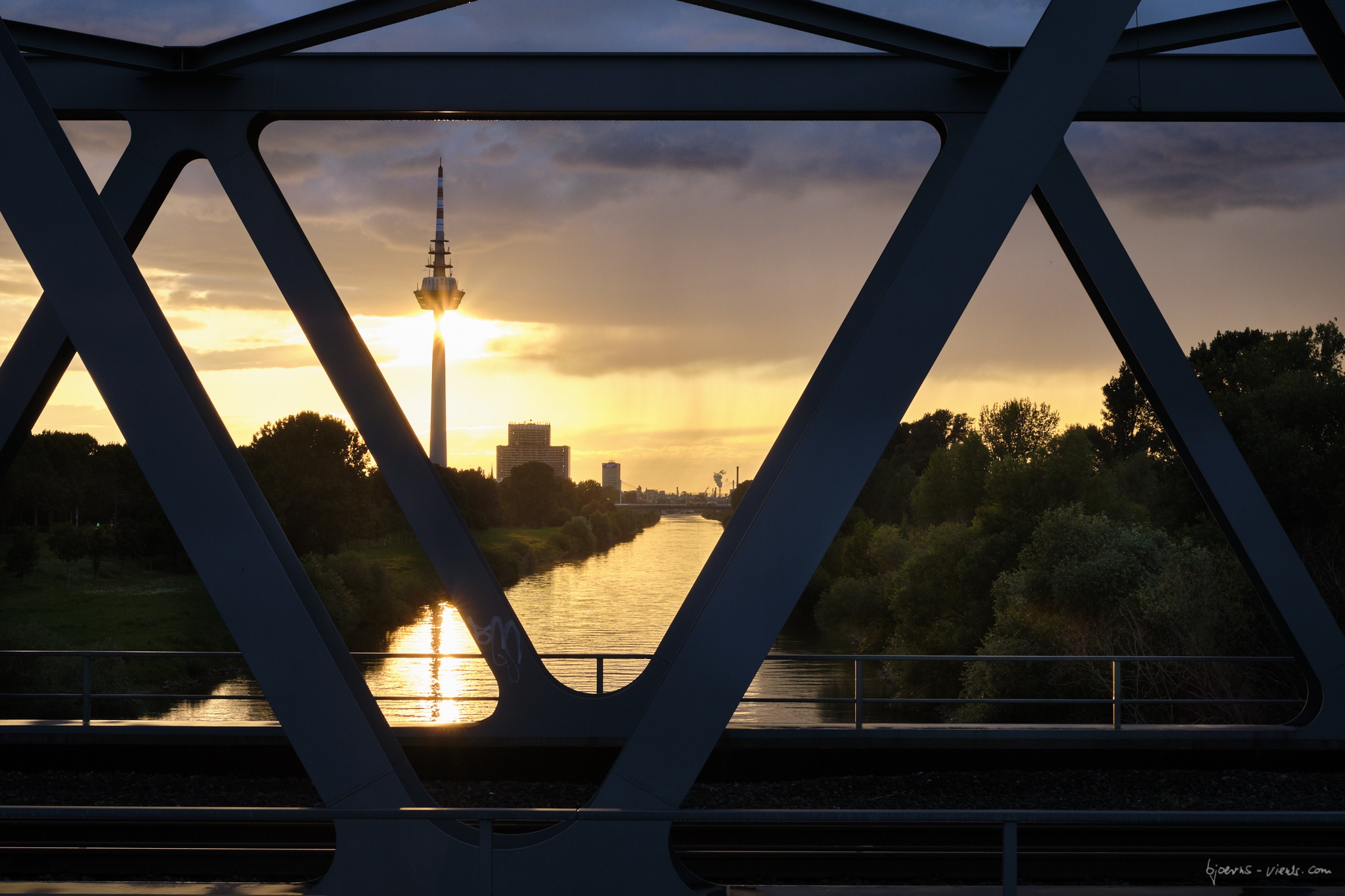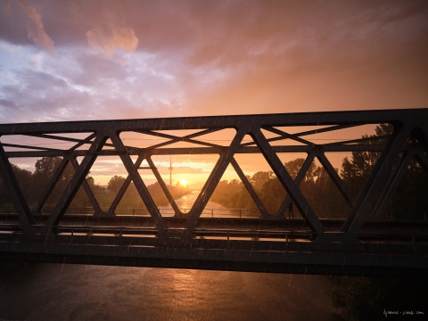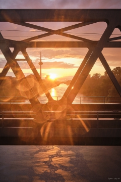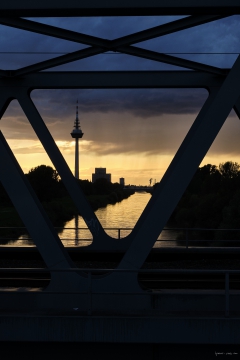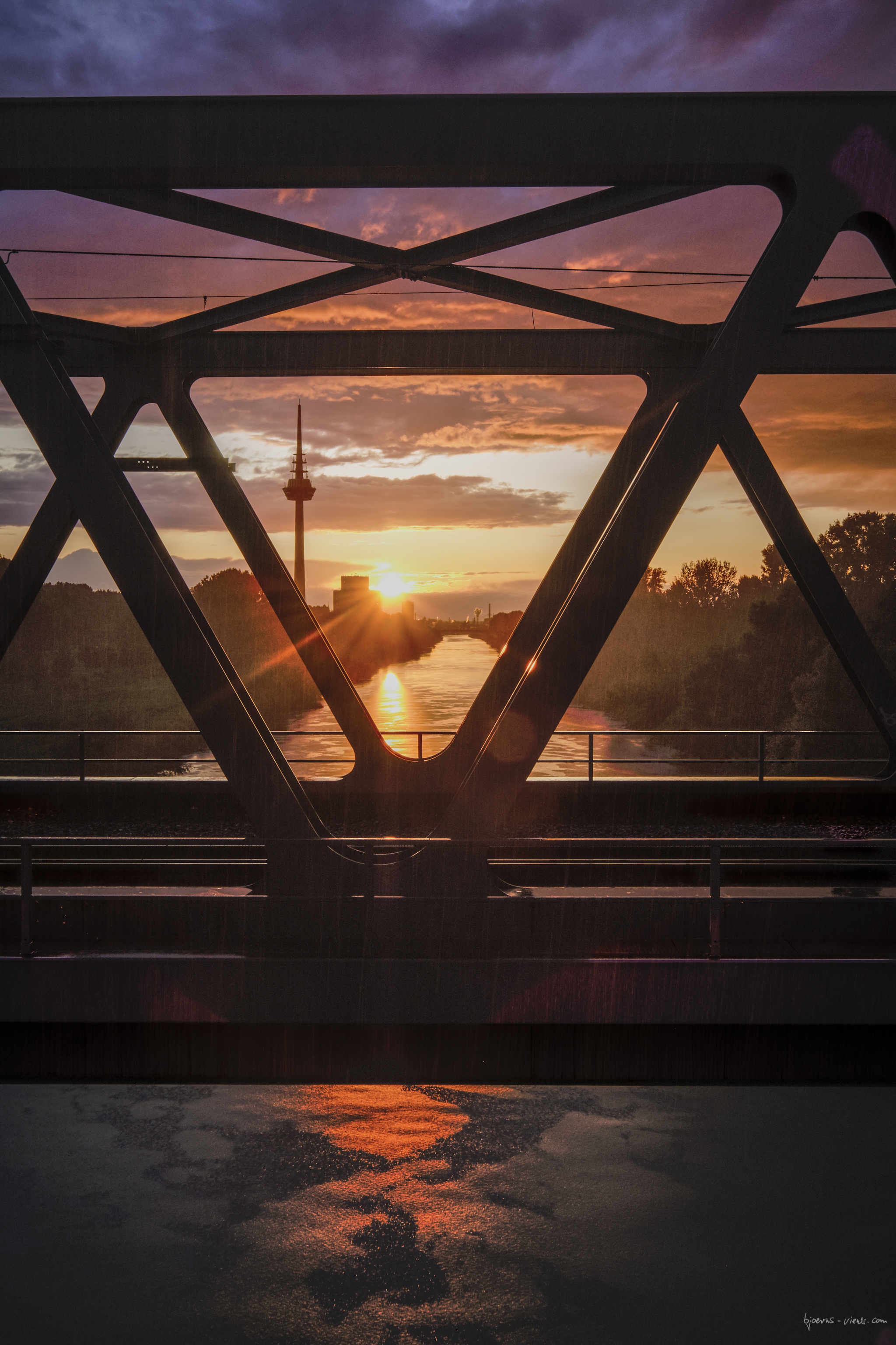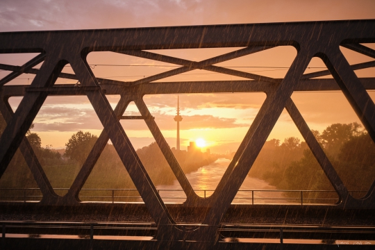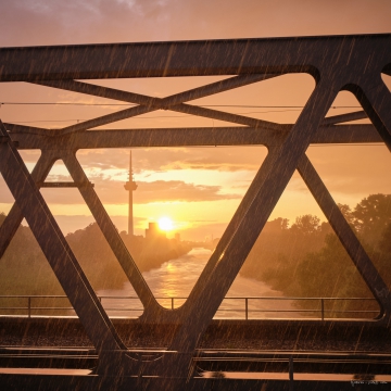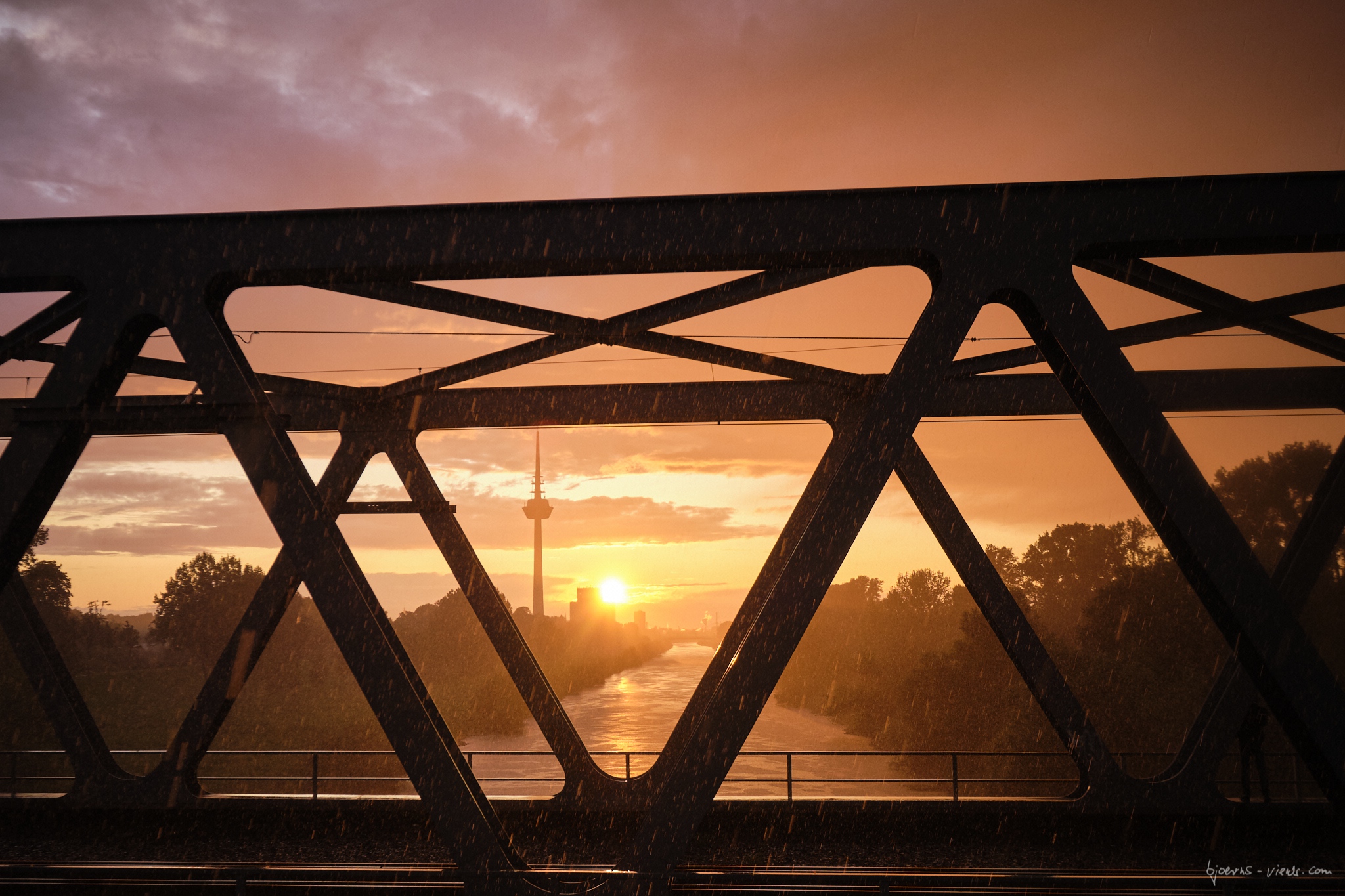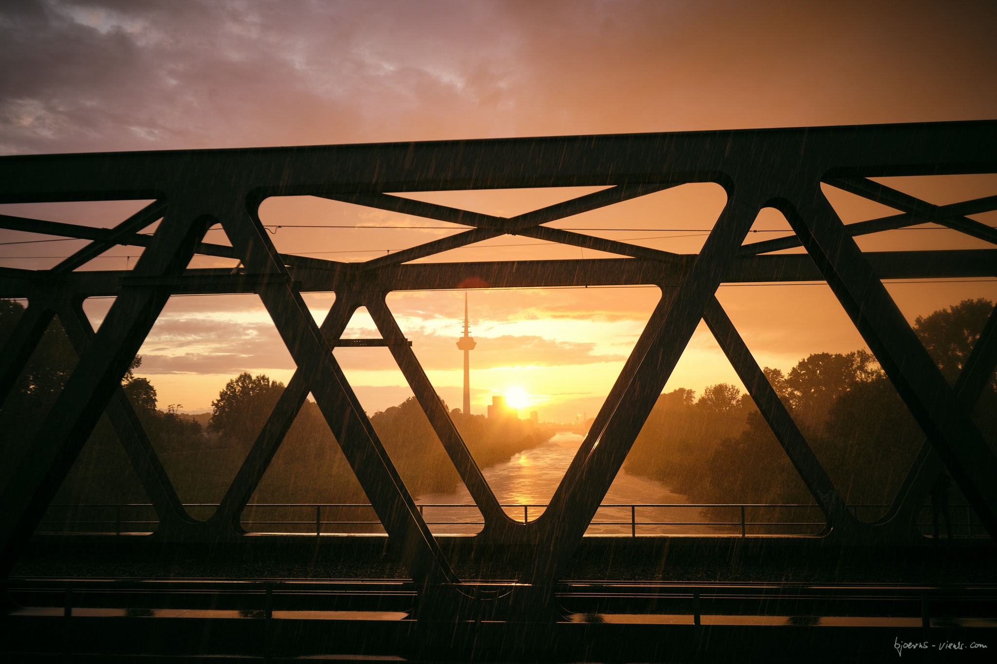 Beim Laufen zum Spot auf der Brücke, wurde ich schon mit leichtem Regen begrüßt. So richtig vertrauenserweckend sah es nicht aus. Aber dann hörte der Regen doch irgendwann auf und so langsam kam etwas Licht und Farbe in Richtung Fernmeldeturm. Erst war die Sonne noch nicht zu sehen, aber bis zum Sonnenuntergang war ja noch eine Stunde Zeit. Und so nach und nach wurde es immer besser. Der Regen hörte erst einmal auf. Die Sonne kam durch, direkt als sie aus meiner Blickrichtung hinter dem Turm war. Zum Teil waren trotzdem noch dunkle Wolken am Himmel. Das Licht wurde immer toller und es wurde ein ganz besonderer Abend. Sonne in der einen Richtung, Regen über mir und auf der anderen Seite ein toller Regenbogen. Es war wirklich schwer, sich zu entscheiden in welche Richtung man fotografieren soll. Und immer mal wieder das Objektiv wieder trocken wischen. 😀