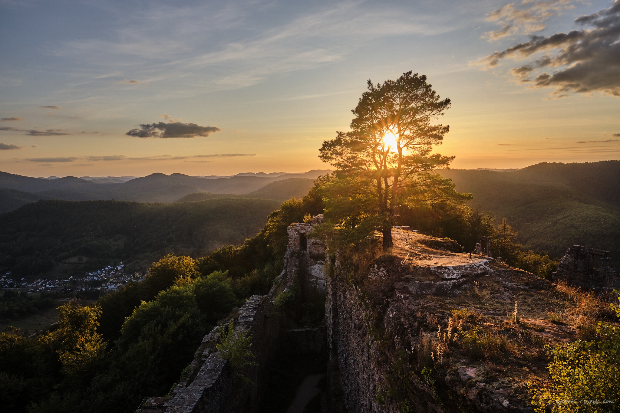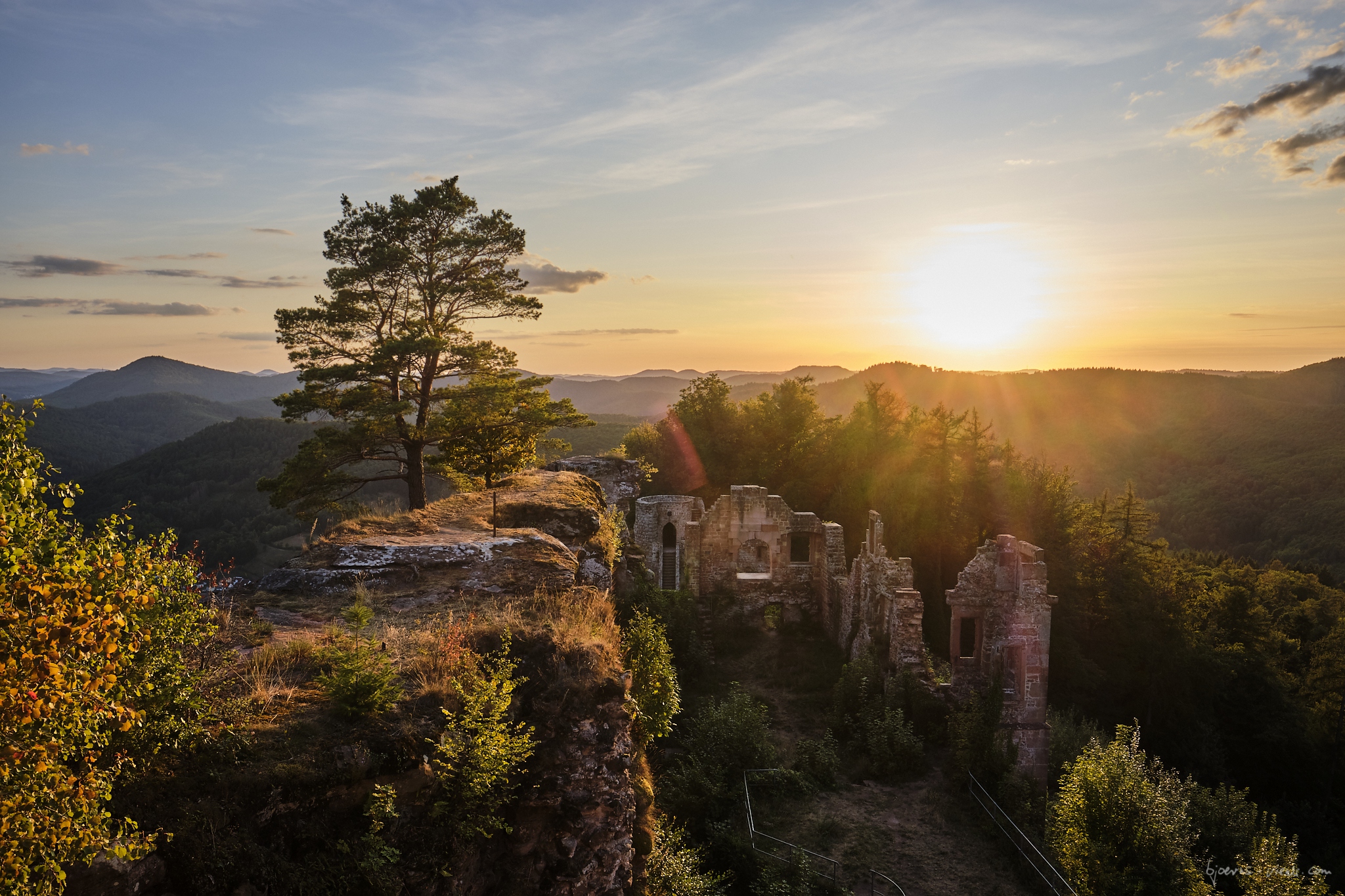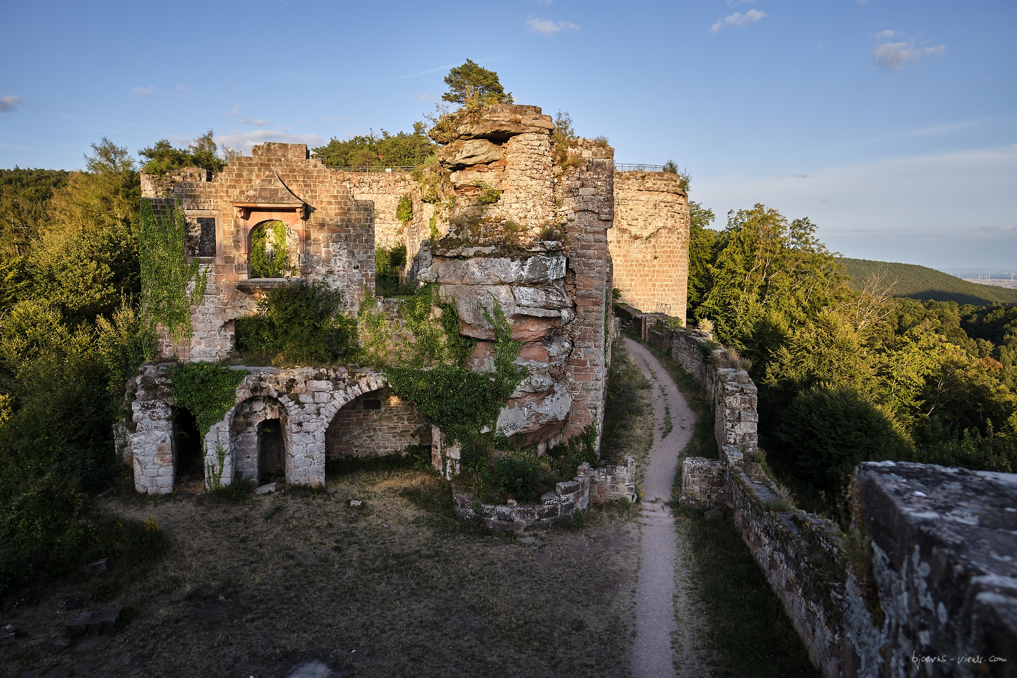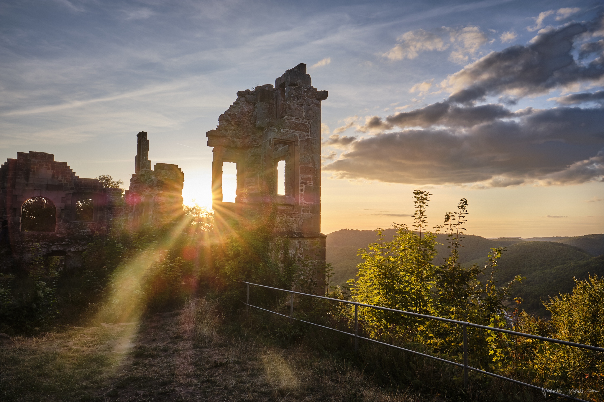 Naja, da habe ich bestimmt jetzt auch was vergessen. Jedenfalls war unser Ziel die Burg Neuscharfeneck, Steffens Idee. Ich war da noch nie und war sehr gespannt. Man munkelte, das wäre eher was für Sonnenuntergang, also haben wir uns für 18:30 Uhr auf dem Parkplatz verabredet. Wir waren beide schon etwas früher da und sind losgezogen. Sonnenuntergang war ca. 20:00 Uhr. Die Laufzeit war, ich schätze, eine dreiviertel Stunde bis zur Burg. Unterwegs hatten wir an einem schönen Aussichtspunkt einen kurzen Halt gemacht.